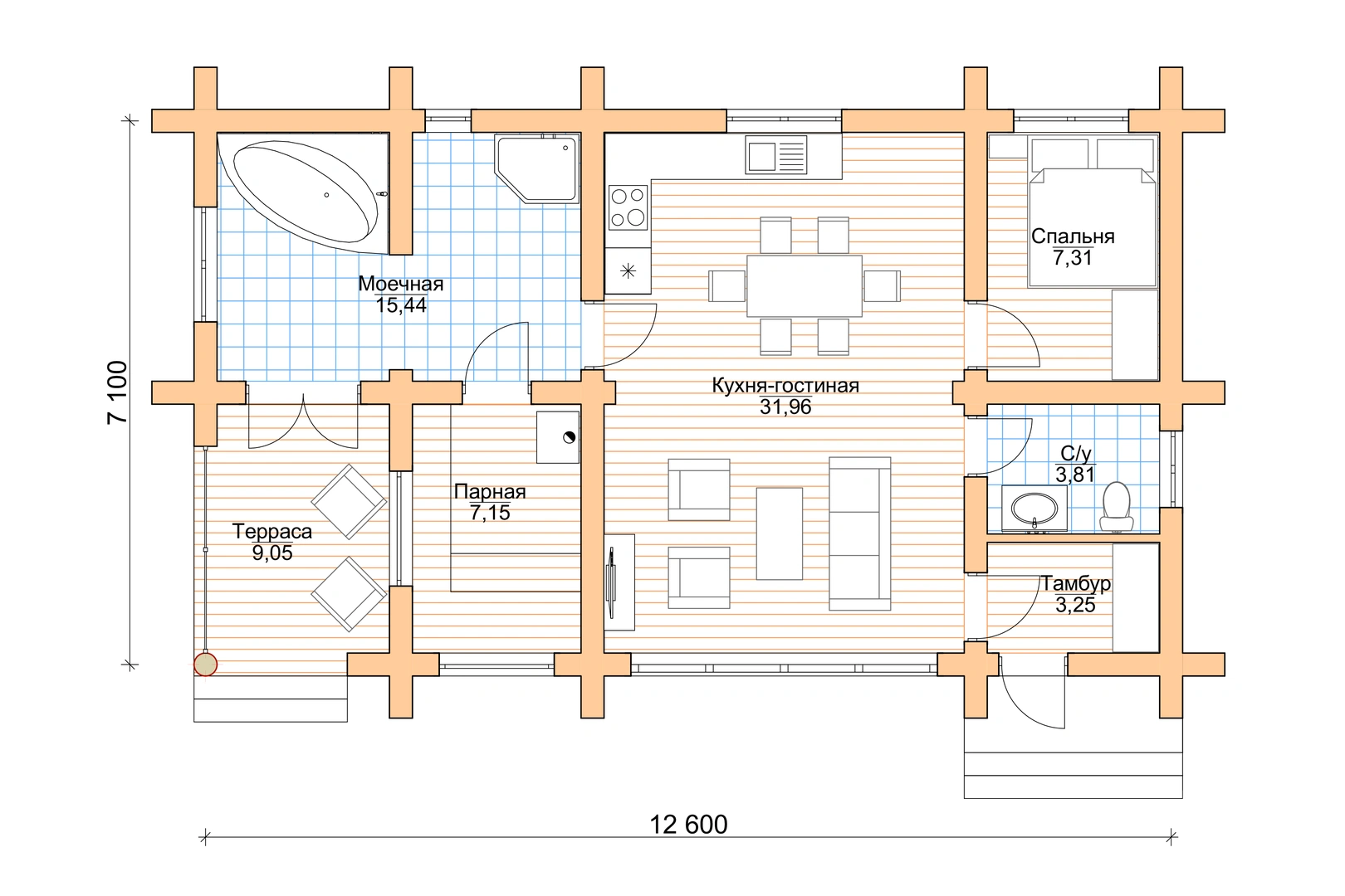 Проектом предусмотрены: терраса - 9,05 м2; тамбур - 3,25 м2; гостиная, совмещенная с кухней - 31,96 м2; санузел - 3,81 м2; спальня - 7,31 м2; моечная - 15,44 м2; парная - 7,15 м2. Такой проект прекрасно подойдет для начальной застройки на пустом участке.