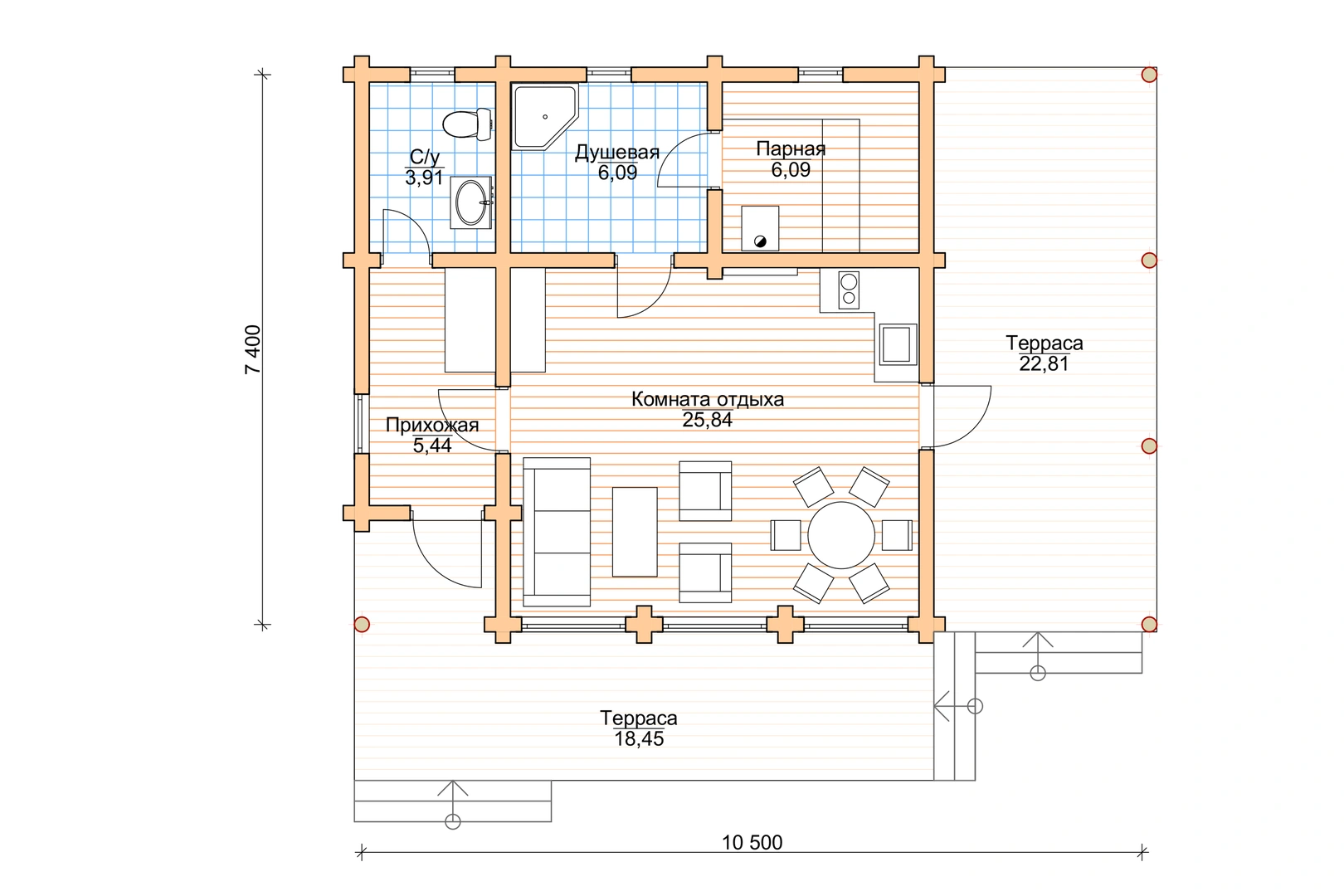 Планировка в себя включает: Две большые террасы 18,45 м2 и 22,81 м2, прихожая 5,44 м2, просорная камната отдыха 25,84 м2, санузел 3,91 м2, душевая 6,09 м2, парная 6,09 м2.